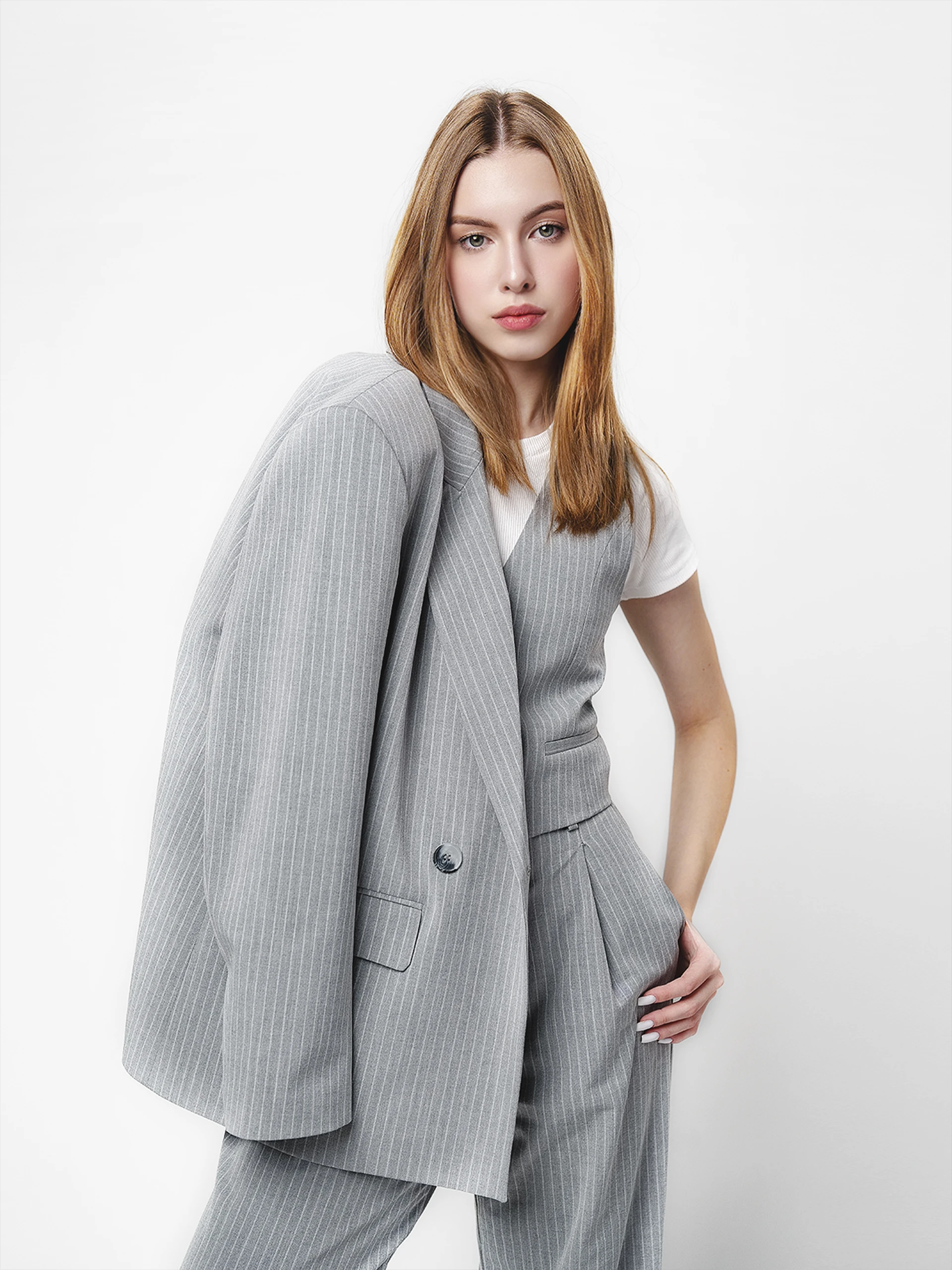The Big Girl Three-Piece Suit Set(ビッグガールスリーピーススーツセット)は、パワードレッシングの極みです。シャープなブレザー、構造化されたウエストコート、ワイドレッグのパラッツォパンツが特徴のこのアンサンブルは、自信と洗練さを放ちます。柔らかなドレープ感のある通気性の良い織物で作られており、磨かれたシルエットを維持しながら、楽に動くことができます。影響力の大きい会議、フォーマルなイベント、または大胆な登場をしたいときに最適なこのセットは、あなたが完全に、そして後悔することなく登場する力を与えます。