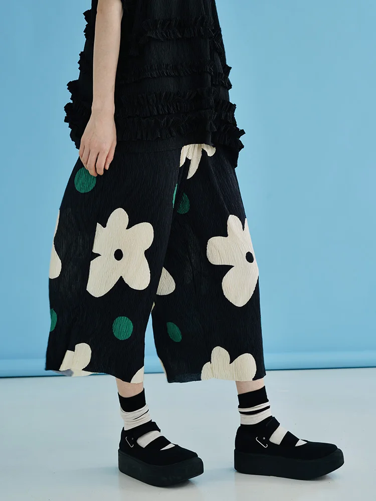 IMAKOKONI original design elasticated waist black summer thin style cropped pants wave dot printed nine cropped pants 223691